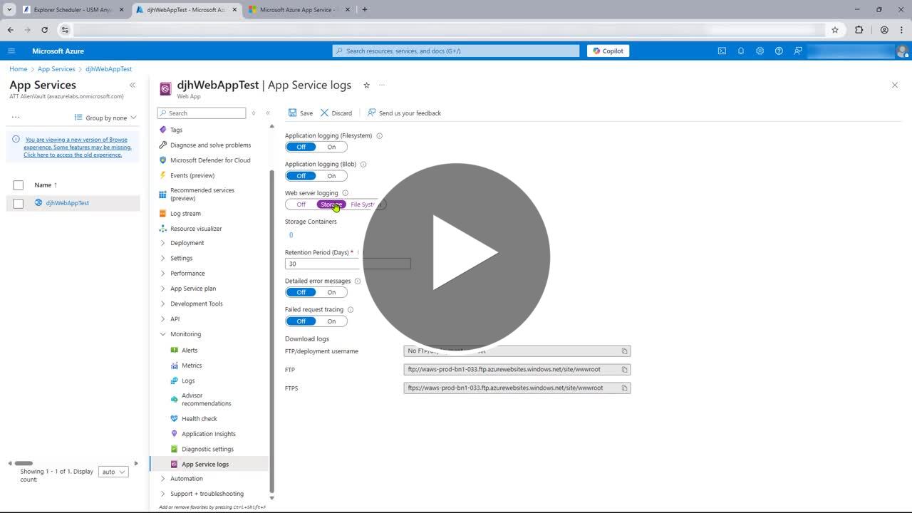 This video demonstrates how to enable Azure Web App logging. You will see how to configure diagnostic (application) logging and configure the scheduled job to pull the logs from Azure.